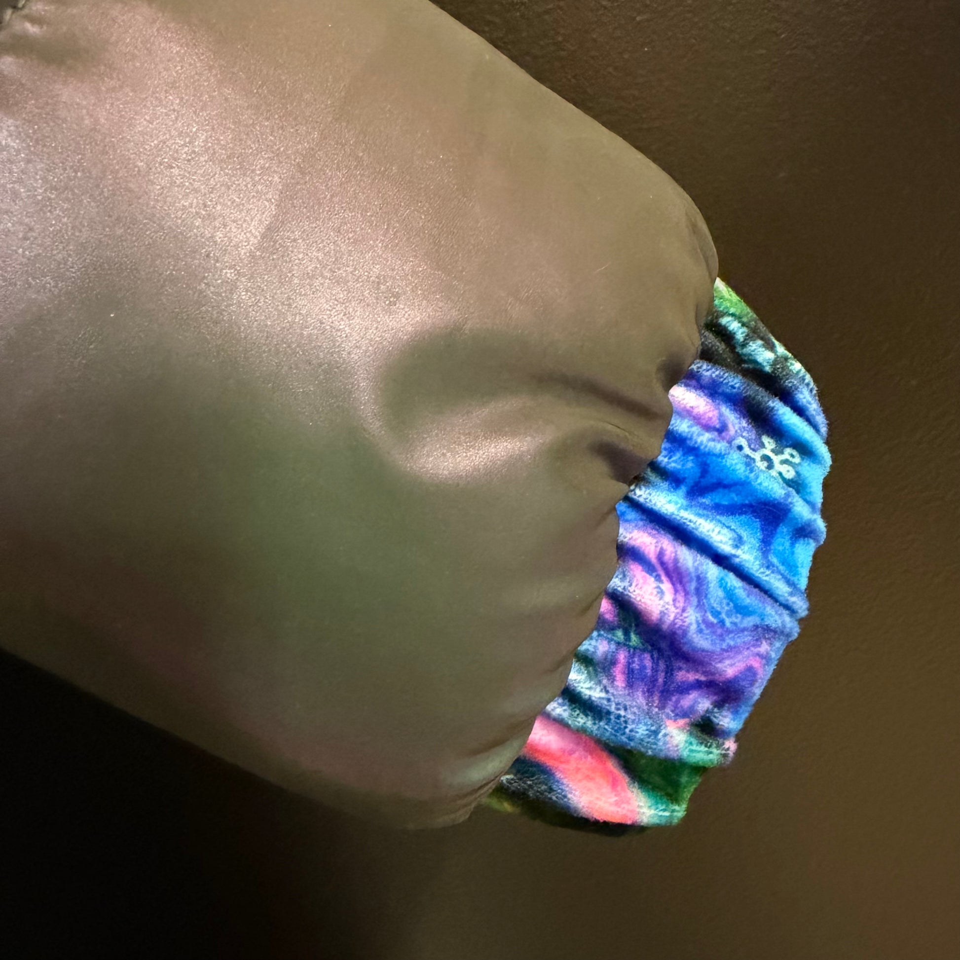 This charcoal-black puffer transforms under light, creating dual visual holographic reflections. The main coat radiates green, blues, and purples, but when you move those iridescent colors shift and the logos reflect a rainbow iridescence. This creates a shocking double rainbow effect.