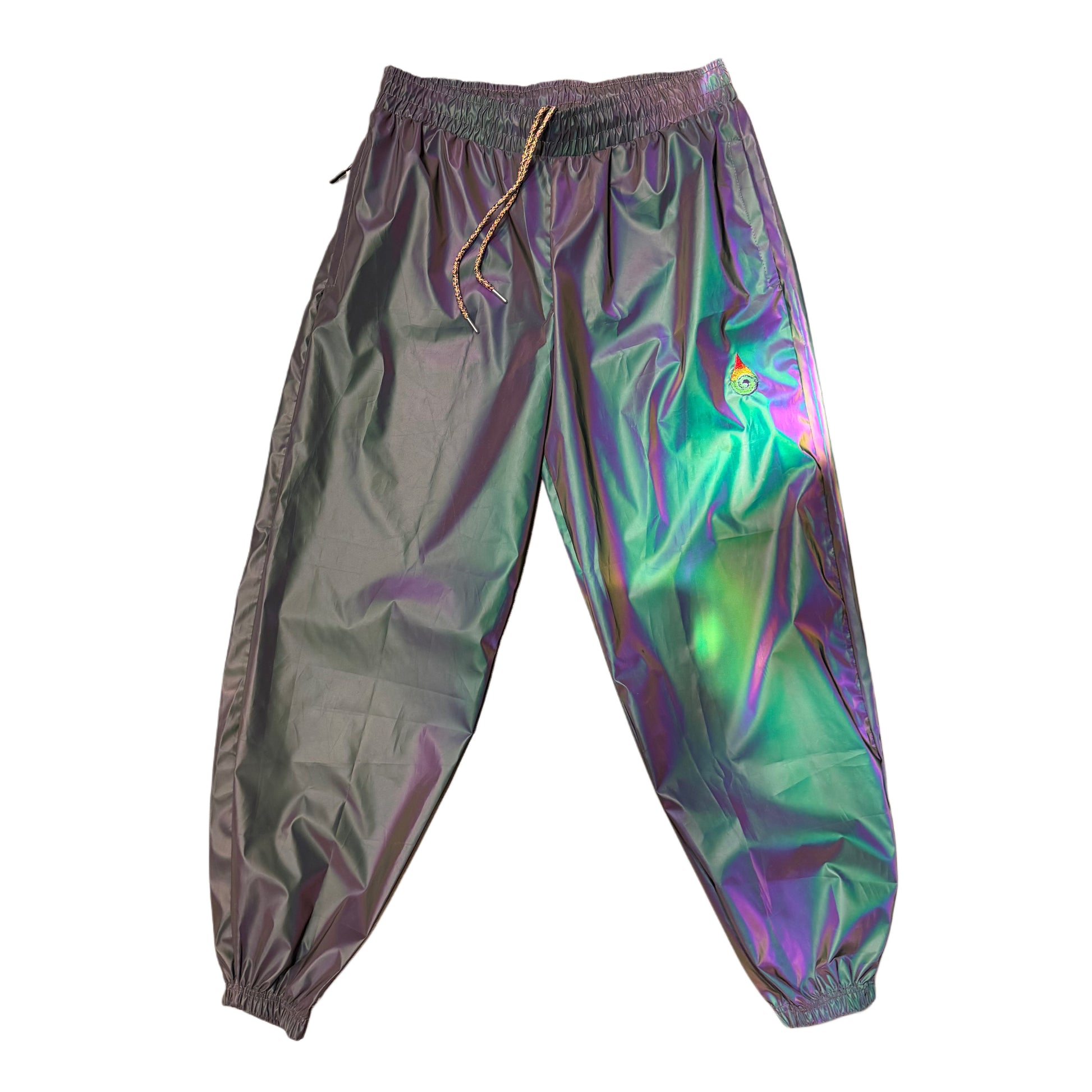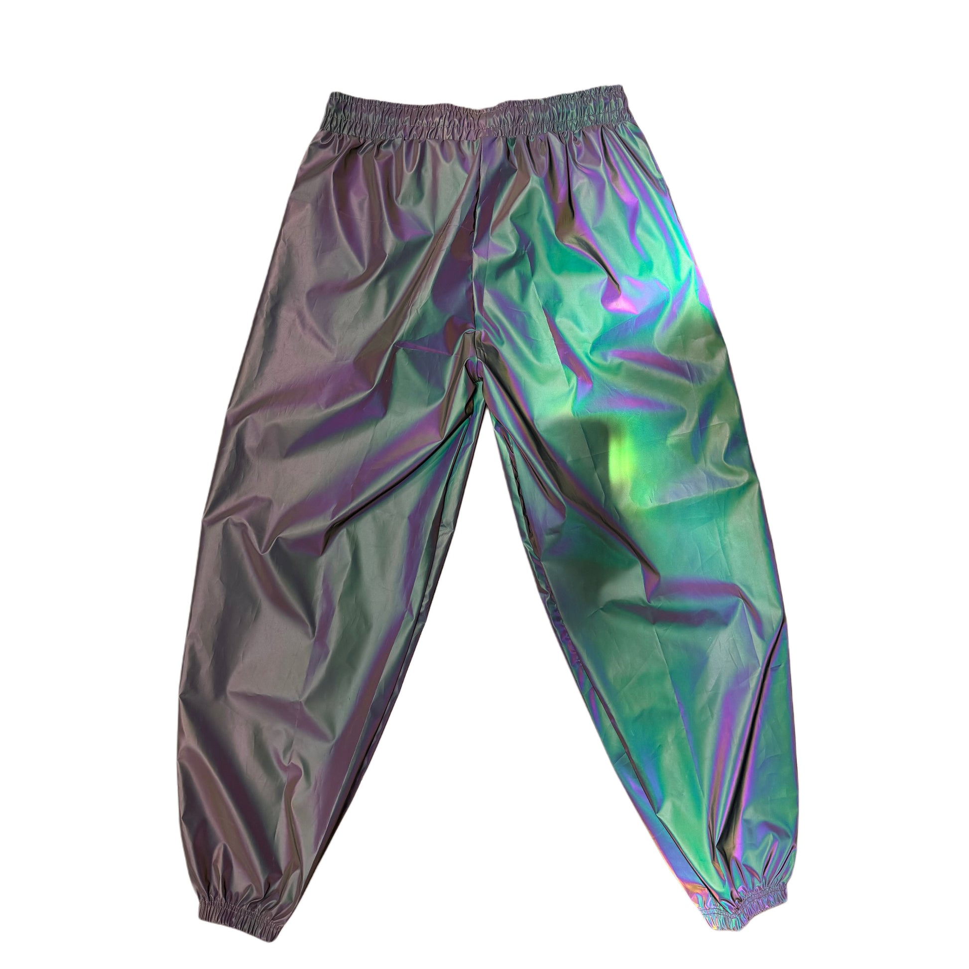 Upgrade your festival and rave look with our Reflective Parachute Pants, which transform from a dark charcoal grey/black to vibrant rainbow hues when light reflects off of them. Give it a try by using your phone's flashlight in the dark, and witness the unreal effect for yourself! Have a friend record you with their flash on and see just how brightly your new style shines. Trust us, these pants are a must-have for any video shoot. Brace yourself for the social media frenzy of views and comments that will come your way!