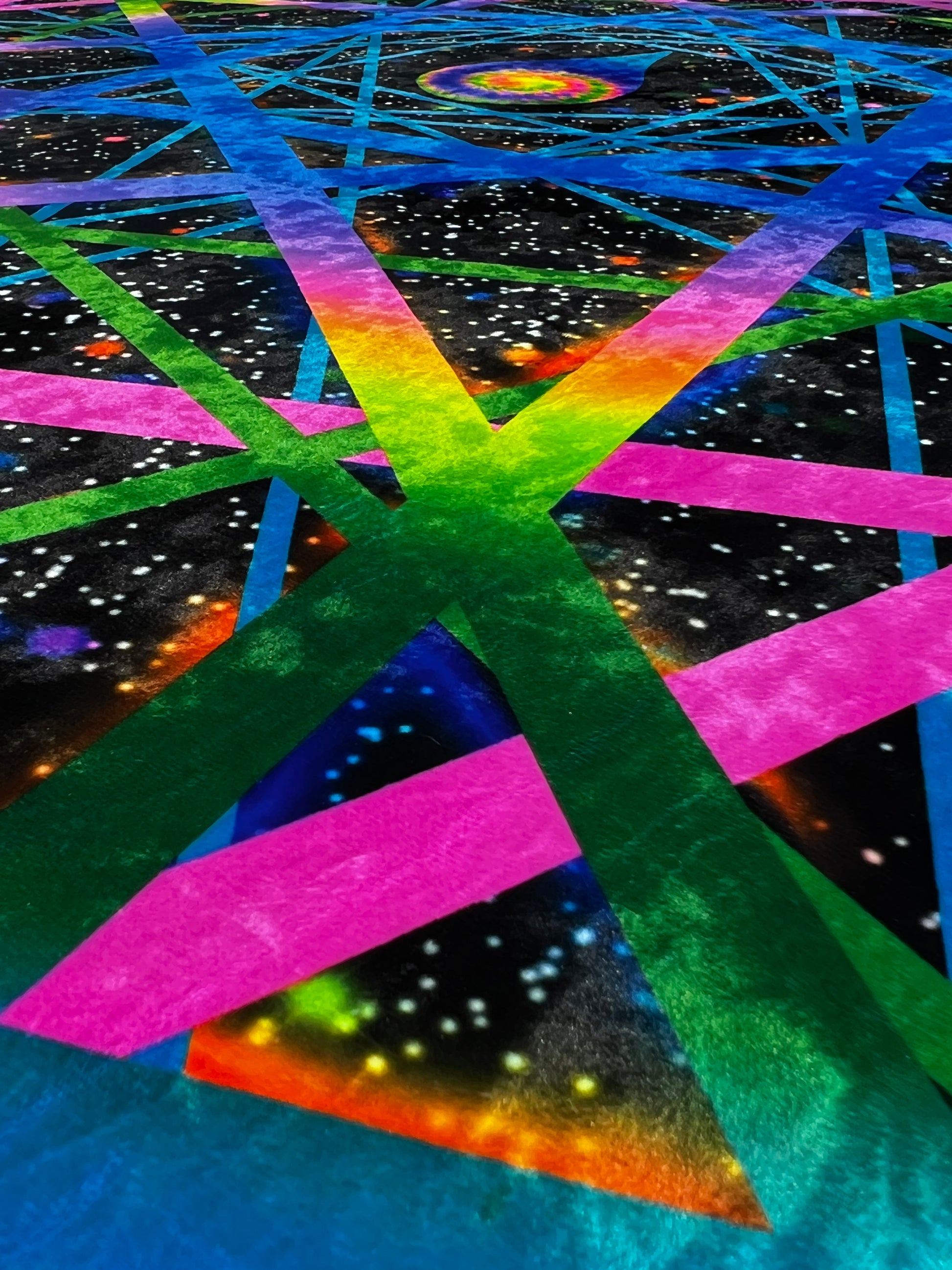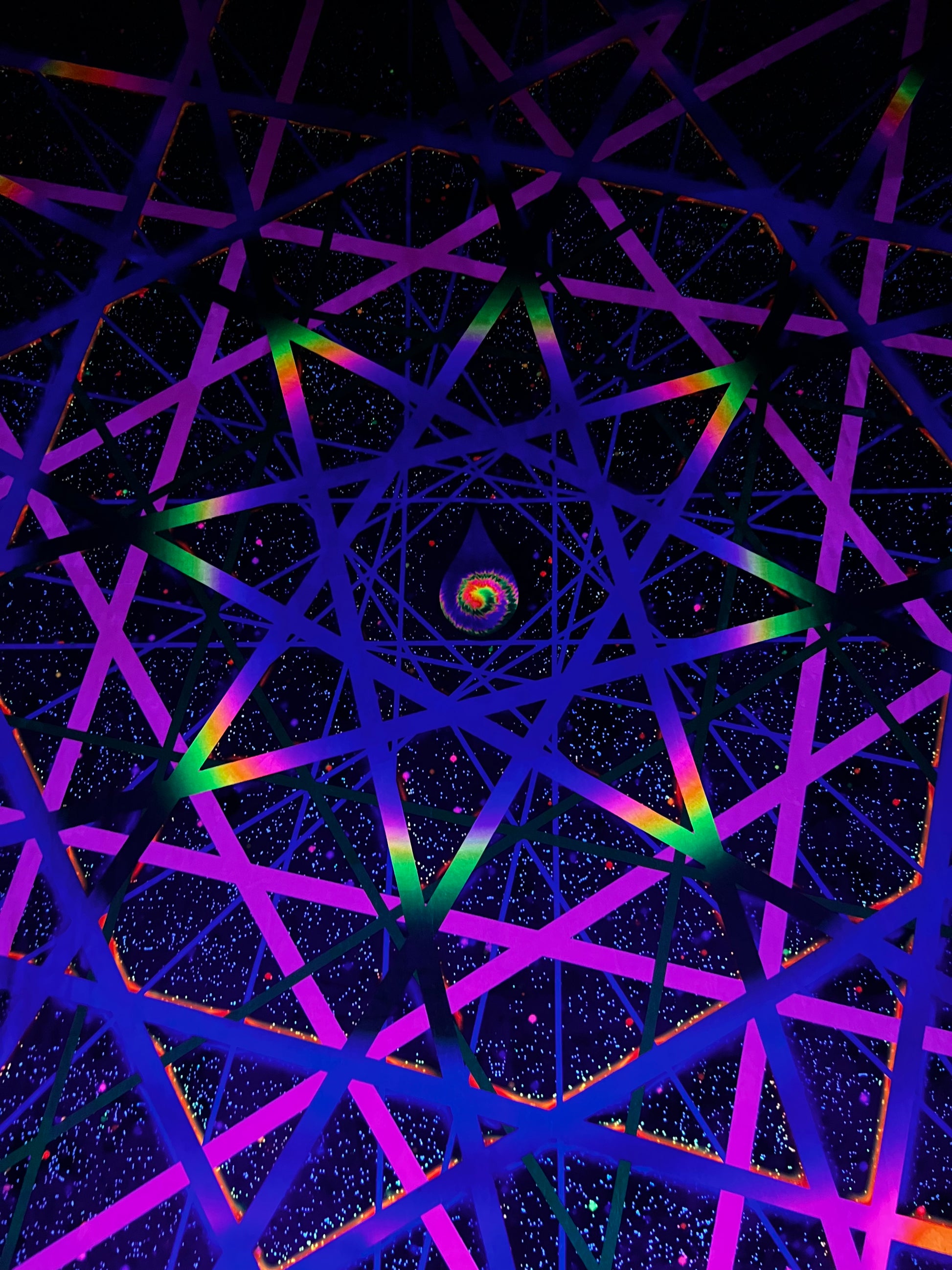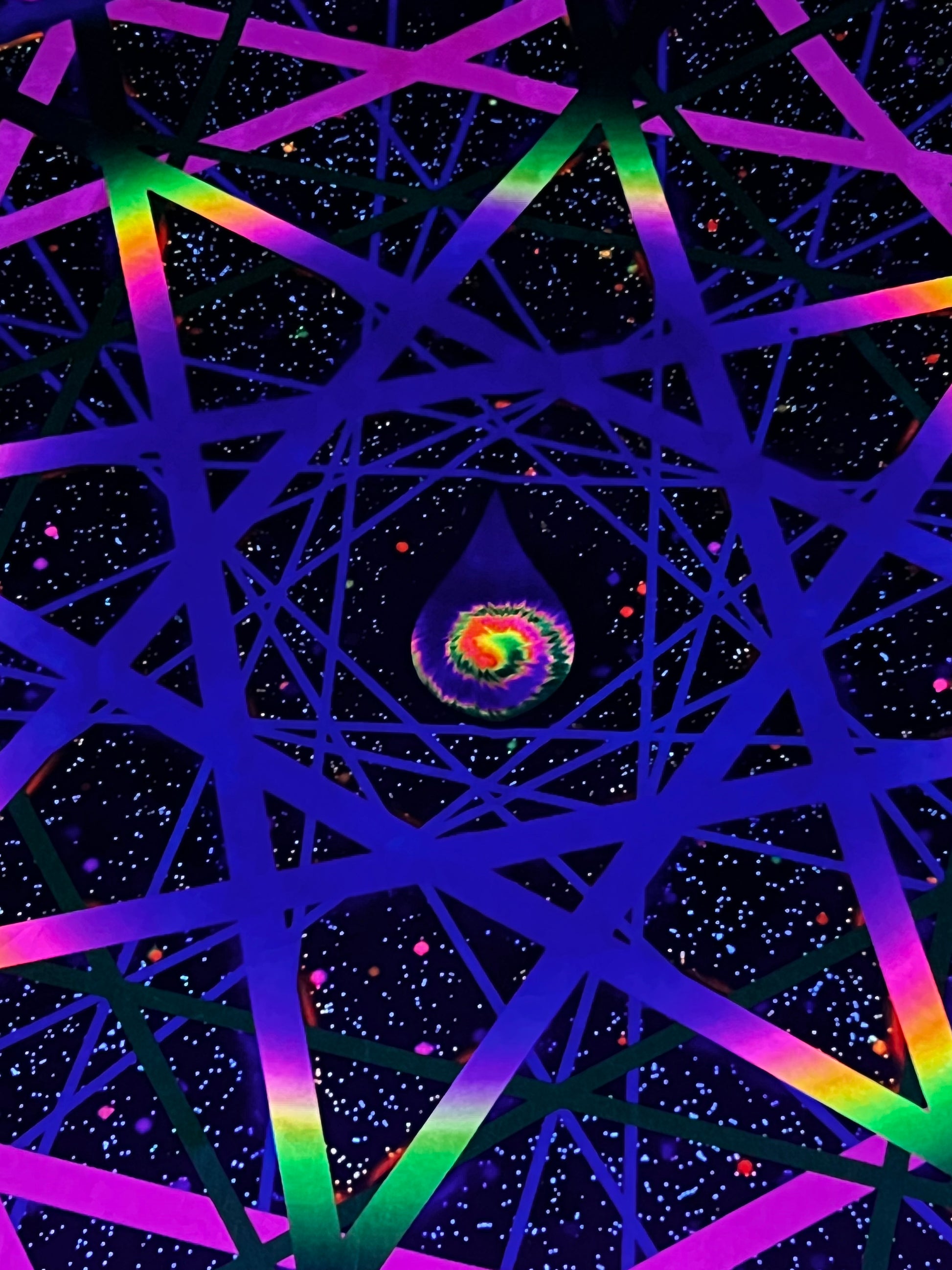 This black light reactive tapestry boasts a dazzling powerful glow and stunning daytime light reflections, thanks to our custom premium crushed velvet fabric. As an added bonus, this 60x80" tapestry also functions as a cozy blanket, perfect for chilly festival nights. Made with super soft fabric that leaves bunnies jealous, this limited edition piece from Drip Drop Labs is a true one-of-a-kind item, signed by the talented owner and artist behind our labs. Get ready to elevate your psychedelic space journey with style and comfort.