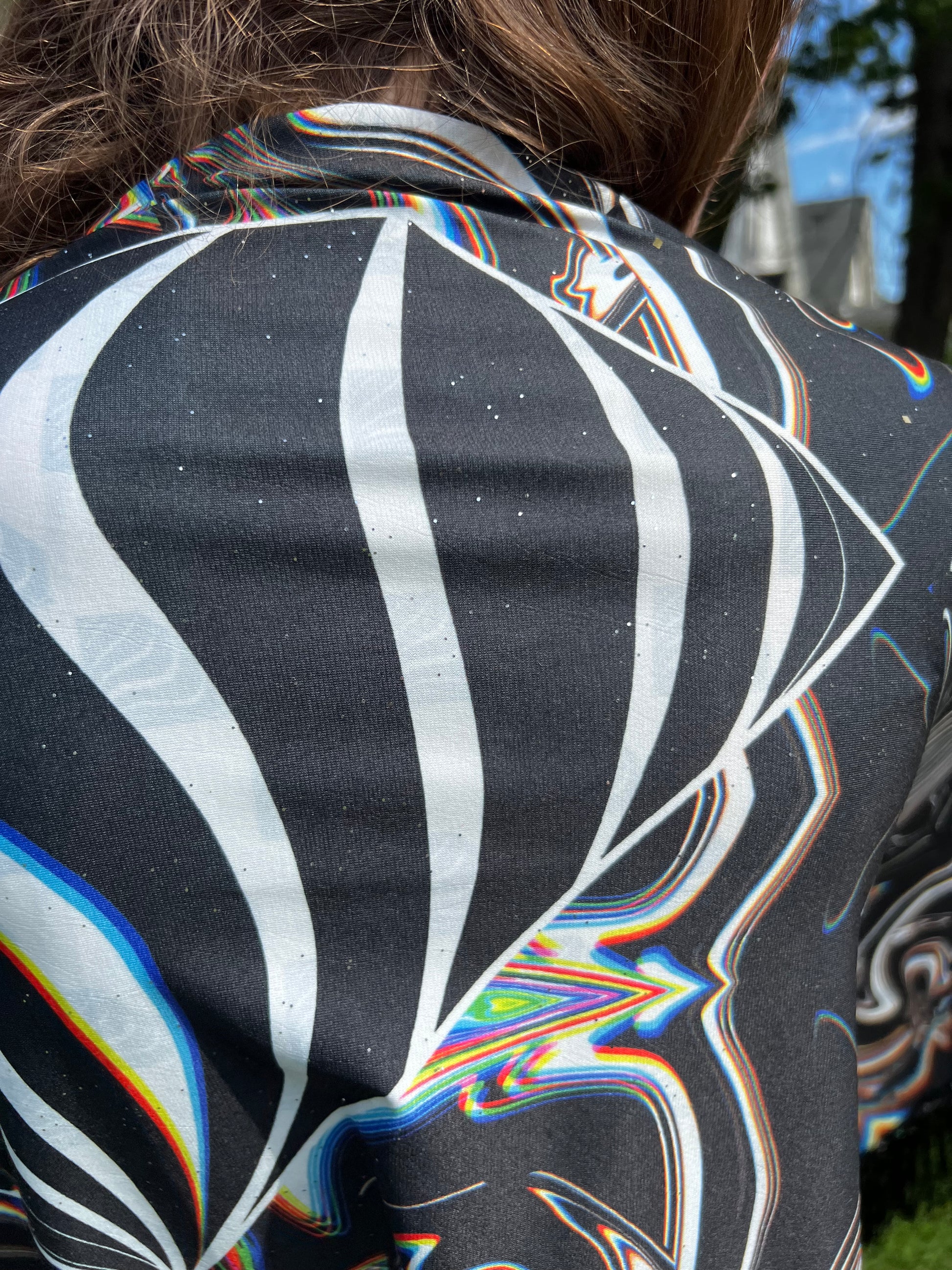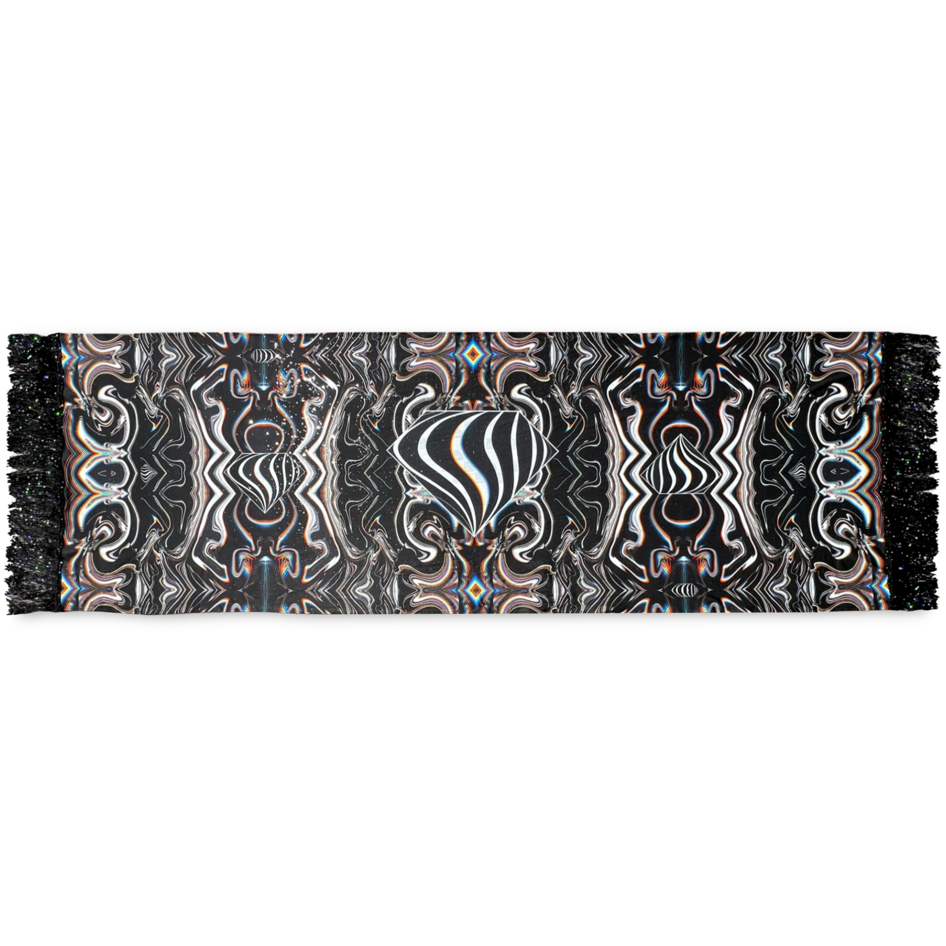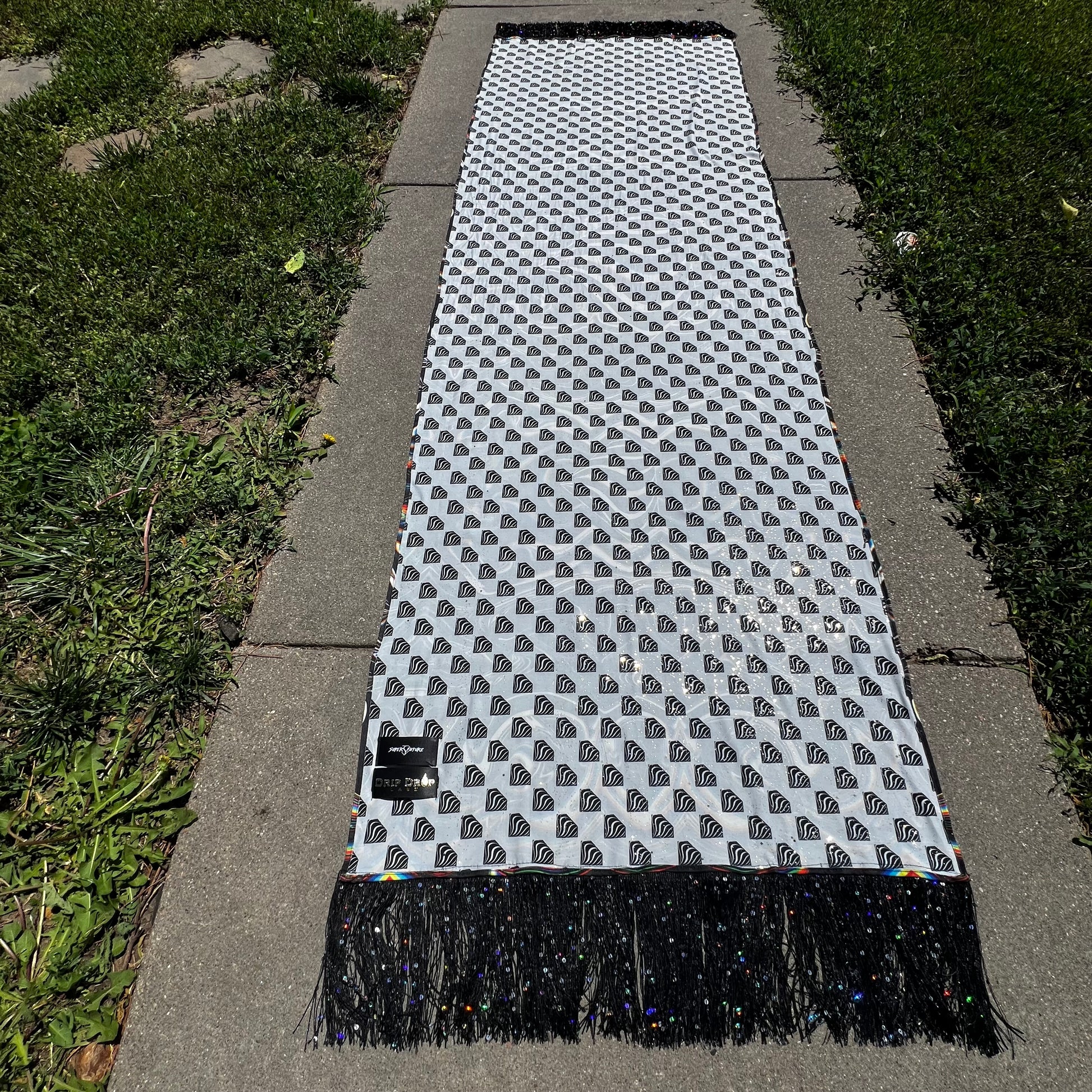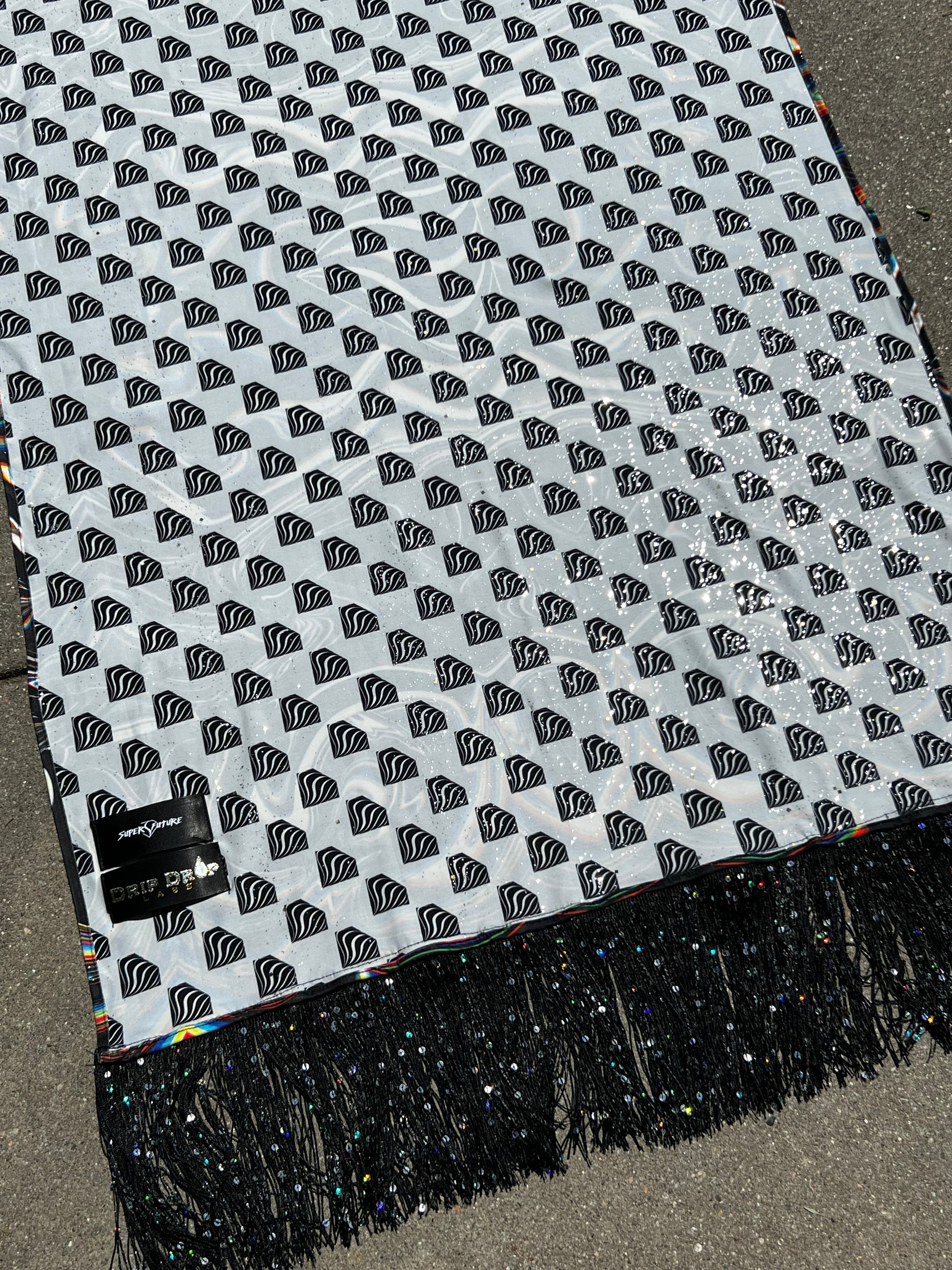 Immerse yourself in a shimmering galaxy with our Galactic Super Future Pashmina. Its permanent holographic glitter reflects the colors around you, while its lightweight and bouncy fabric drapes effortlessly for a cooling and flowy feel. Perfect for festivals, this one-of-a-kind piece by Drip Drop Labs adds a touch of unique luxury to any outfit.