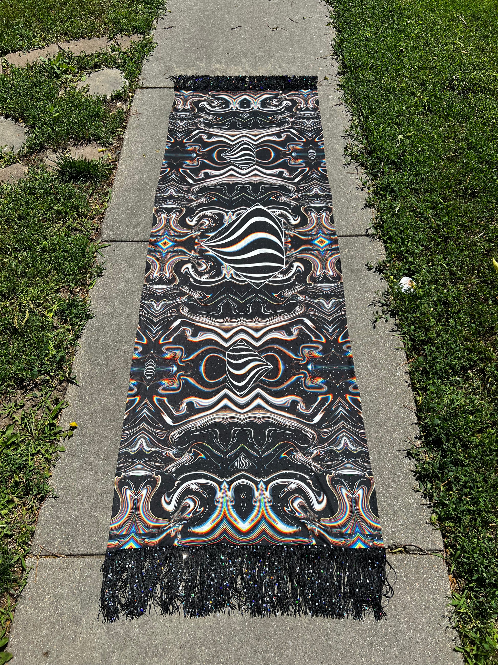 - 76 x 30” with 4” sequin tassels on either side