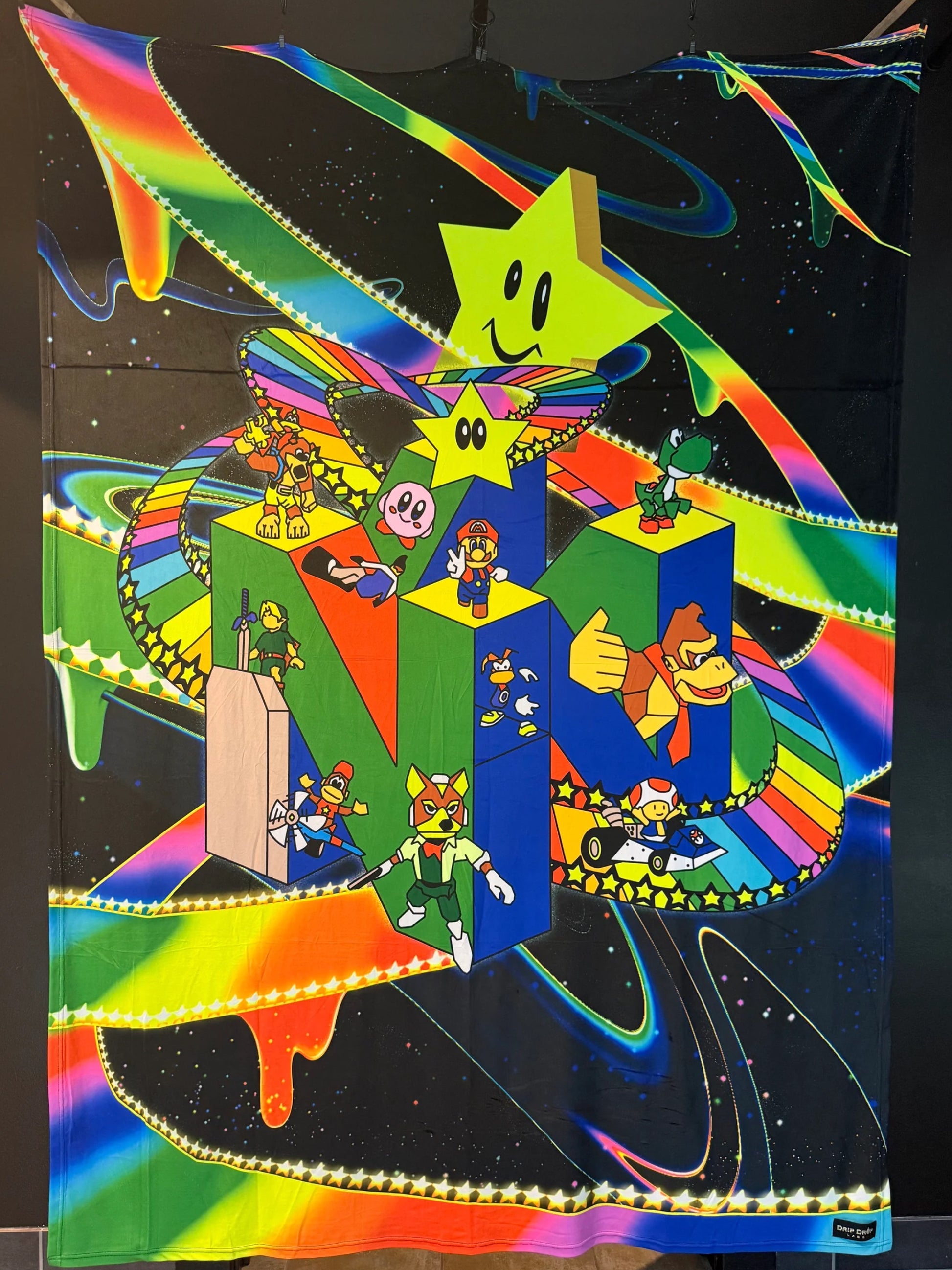 This black light reactive tapestry boasts a dazzling powerful glow and stunning daytime light reflections, thanks to our custom premium crushed velvet fabric. As an added bonus, this 60x80" tapestry also functions as a cozy blanket, perfect for chilly festival nights. Made with super soft fabric that leaves bunnies jealous, this limited edition piece from Drip Drop Labs is a true one-of-a-kind item, signed by the talented owner and artist behind our labs. Get ready to elevate your psychedelic space journey with style and comfort.