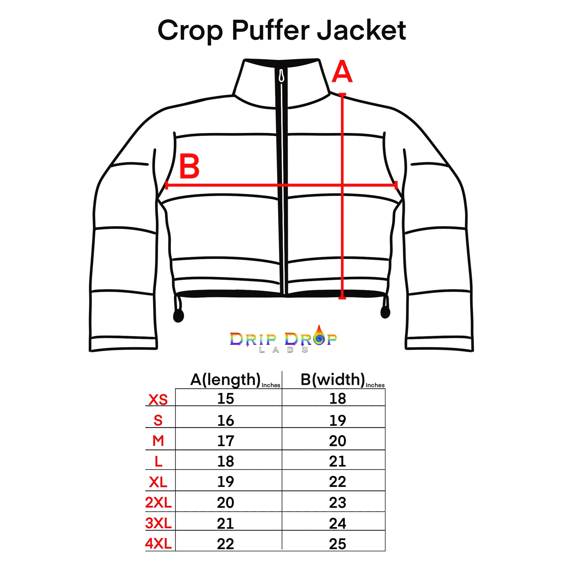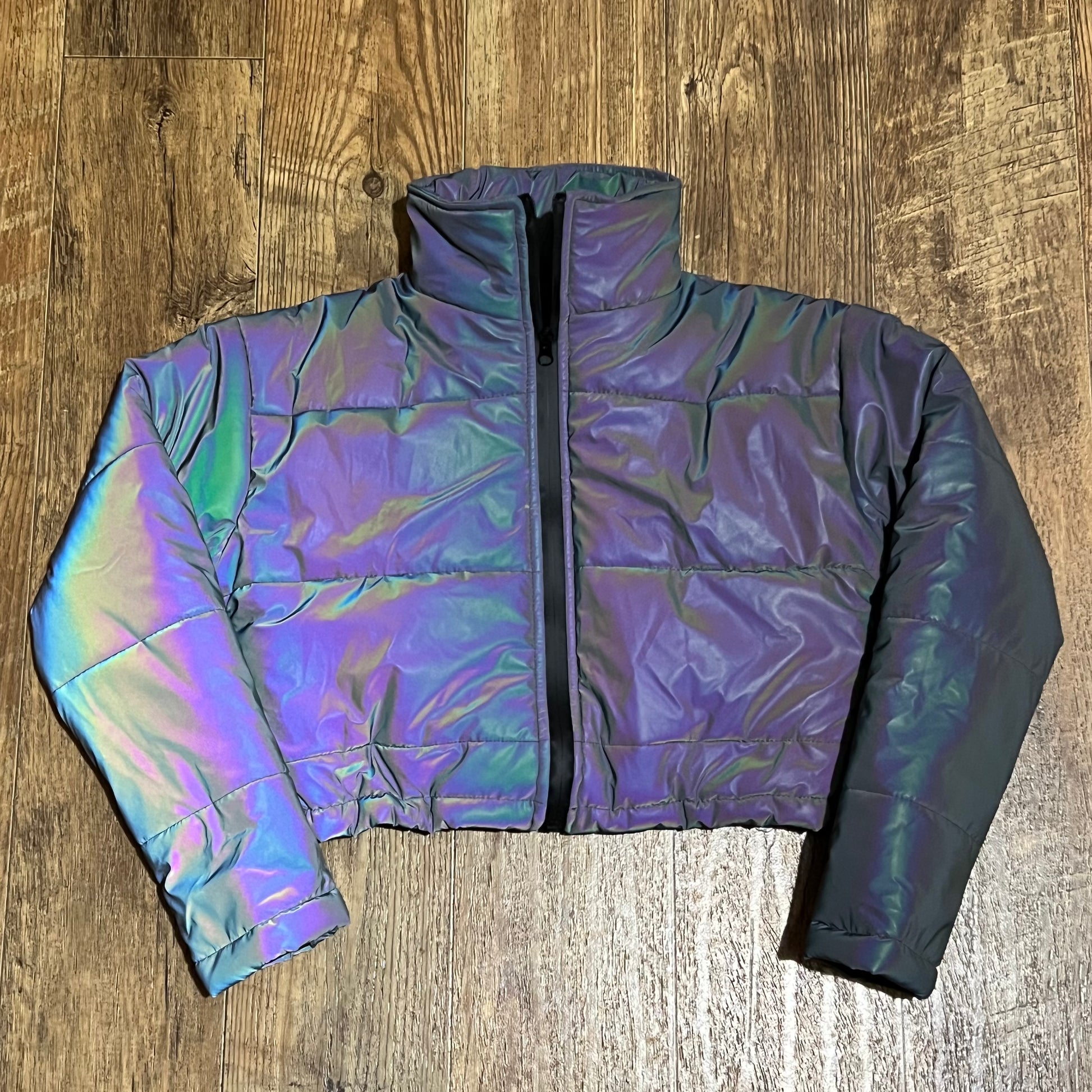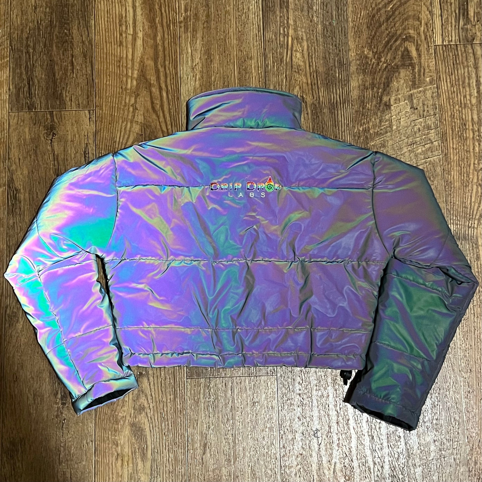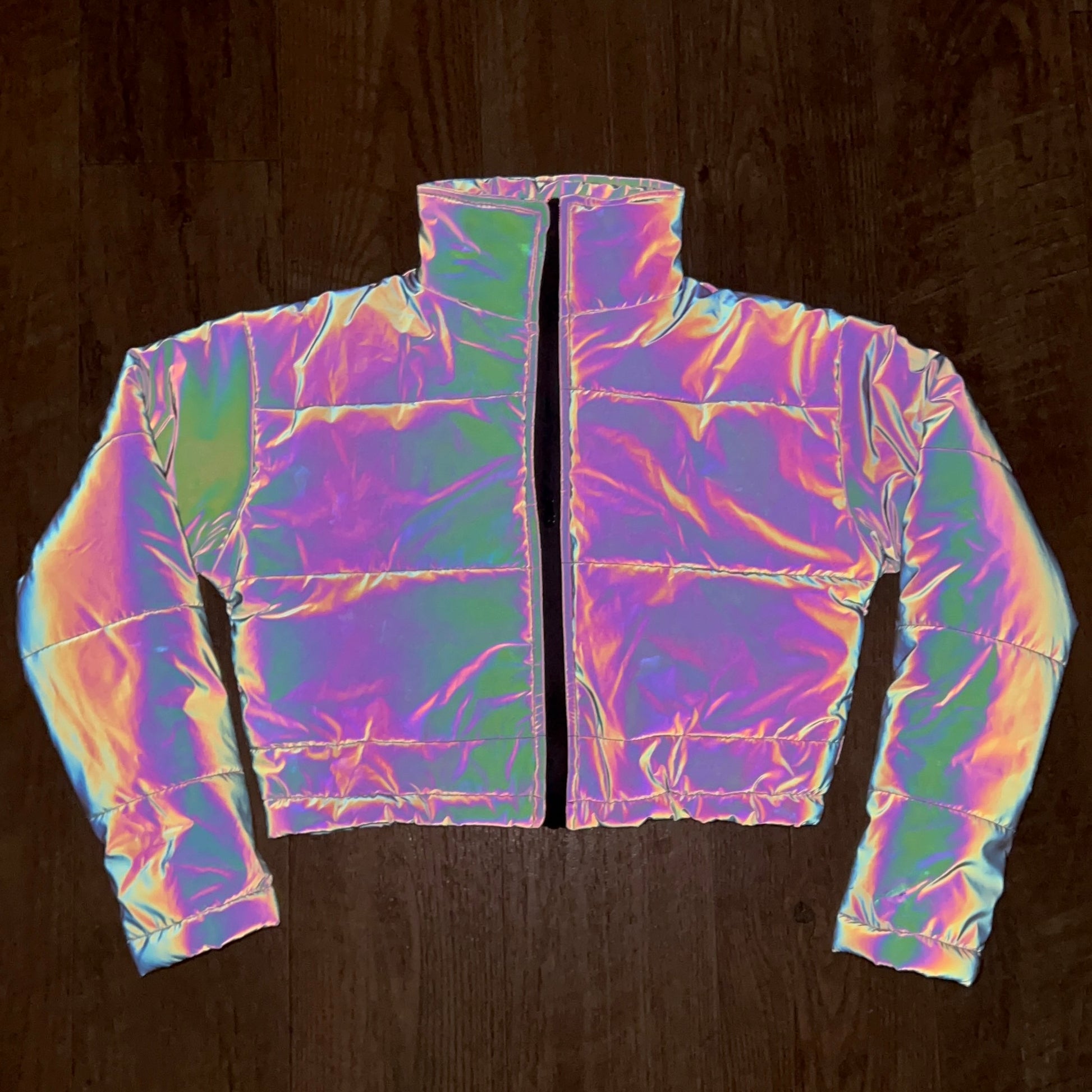 Our reflective crop puffer jacket will turn from a dark charcoal black to bright & vibrant inverted rainbow colors when the light grazes on it.  Full light on it while your out in the dark makes this jacket look unreal. Like seriously some alien technology clothing from the future.  Give your social followers some videos to drool over in this jacket unlike any other.