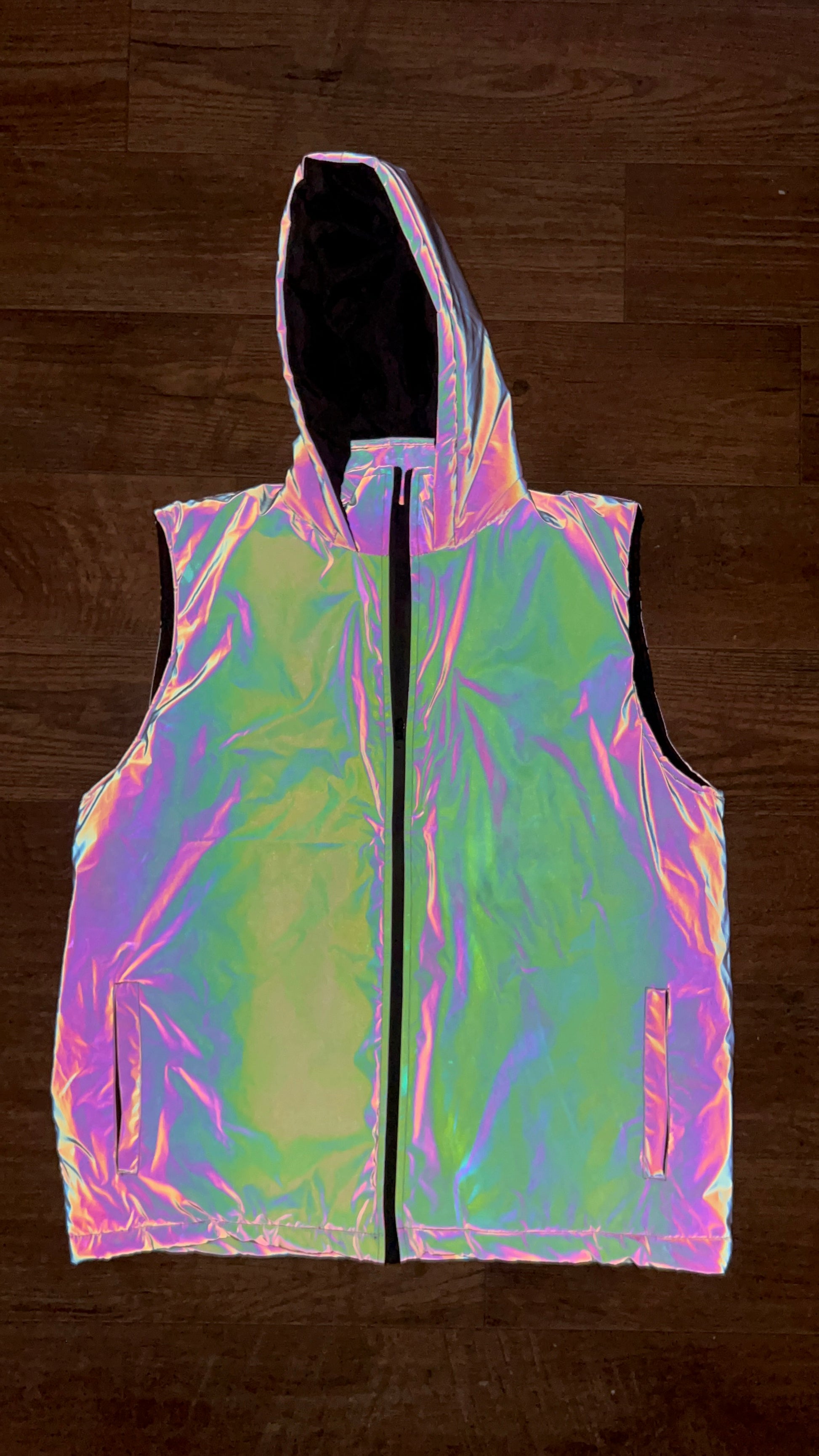 Our reflective jacket will turn from a dark charcoal black to bright & vibrant inverted rainbow colors when the light grazes on it.  Full light on it while your out in the dark makes this jacket look unreal. Like seriously some alien technology clothing from the future.
